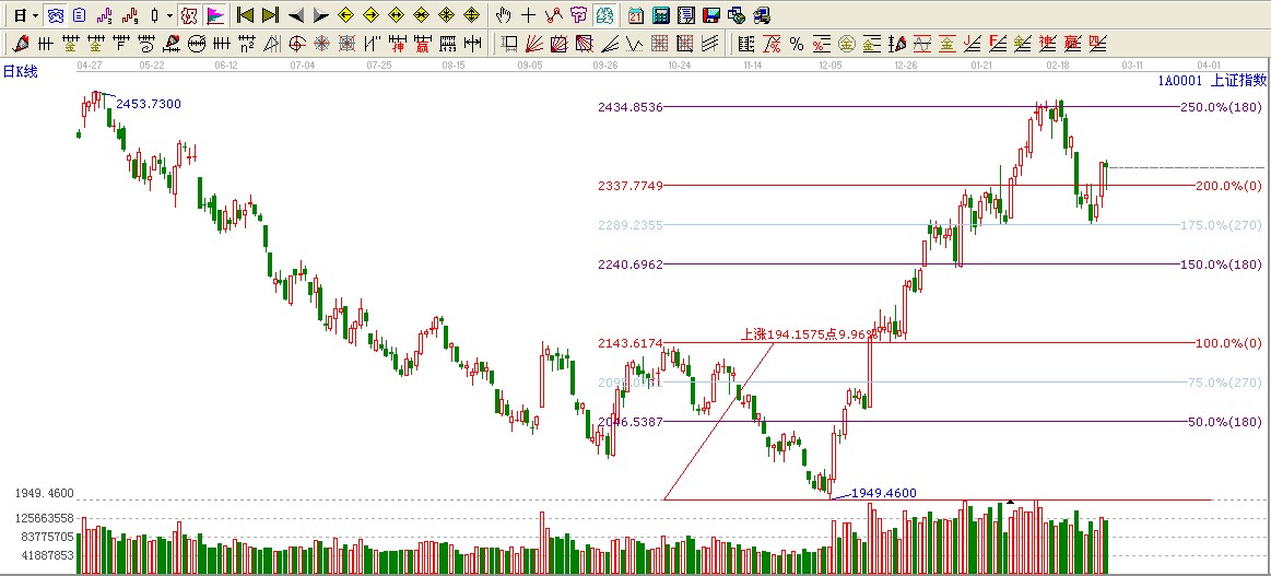 ★依據(jù)贏家波段百分比延伸線提示:目前大盤處于波段百分比延伸線200%(0)度位置2337點(diǎn)此位置不破看高至250%(180)度位置2434點(diǎn)附近。