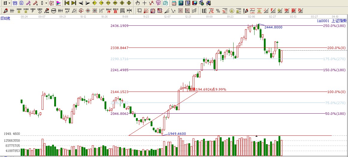 ★依據贏家波段百分比延伸線提示:大盤站穩270度位置2290后一路快速上行,上方第一壓力在200%(0)度位置2338附近壓力。