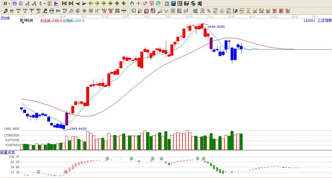 ☆依據(jù)贏家乾坤K線提示:目前大盤運行在關注線下方,藍色區(qū)域,看空。