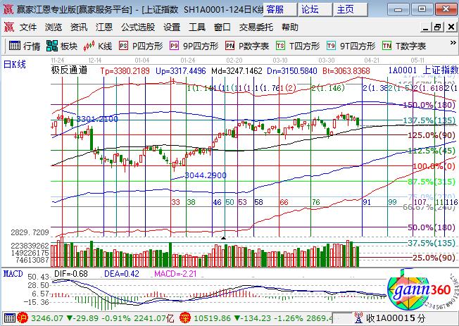 大盤上周五低開低走中陰殺跌0.91%,深成指和中小創大跌1%以上,創業板創近期新低。板塊方面,兩市僅船舶板塊收紅,煤炭有色、石油、銀行相對抗跌;盤面無熱點,黃金、高送轉盤中有表現但力度有限,粵港澳、雄安新區、一帶一路概念領跌,個股下跌居多。技術方面,日線收盤跌破贏家江恩百分比135度位置,下方極反通道生命線、江恩百分比90度為下方支撐帶,點位分別是3233、3210點,短周期均運行在生命線以下弱勢通道,操作頻率降低,注意觀察支撐帶支撐有效性,波段4成倉位,短線3成倉;3223、3210為日內支撐,3255、3263為日內阻力,僅供參考,不構成任何投資建議。