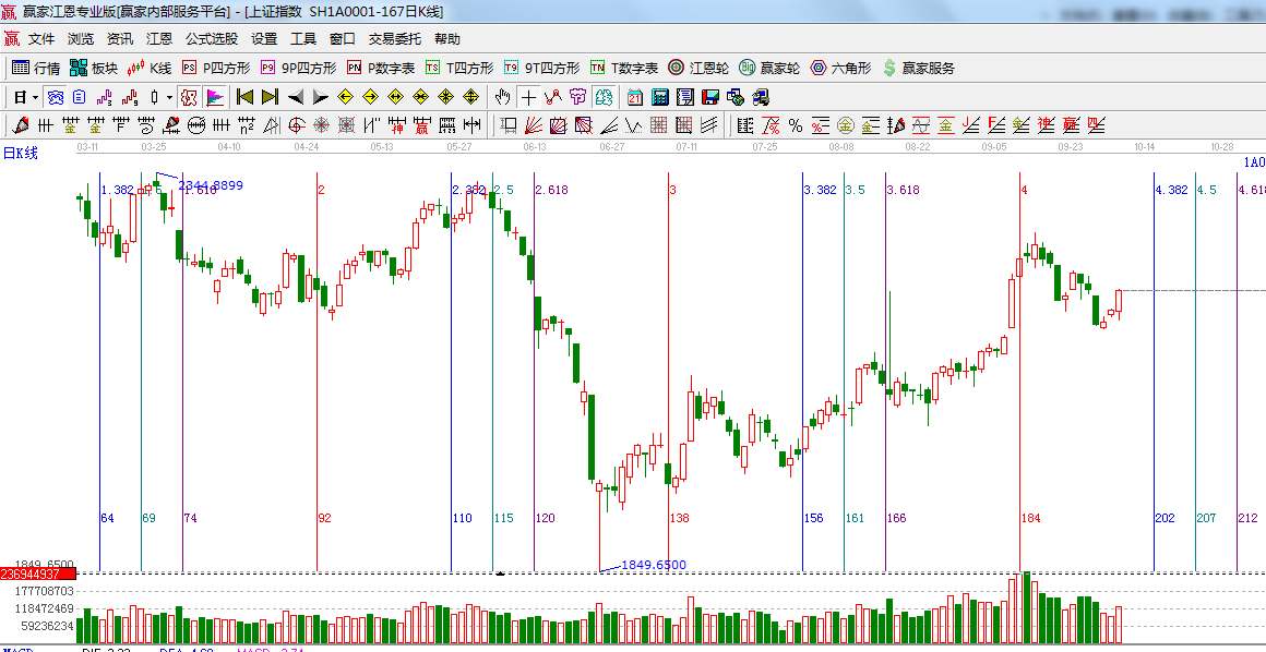 ☆依據贏家江恩系統乾坤K線提示: K線顏色仍為紫色,等待市場方向的選擇;