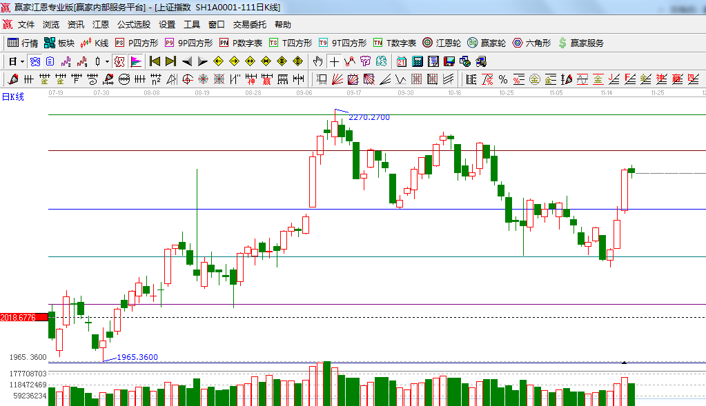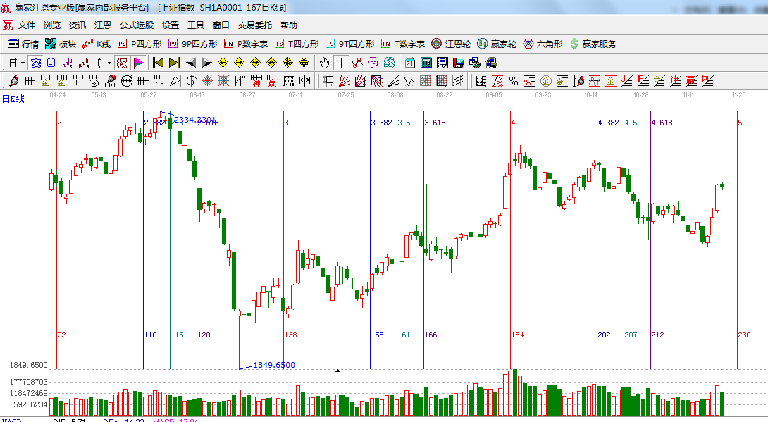 ☆依據贏家江恩系統波段百分比延伸提示:黃金分割價格圖0.236位置是2219點,0.382位置是2050點;