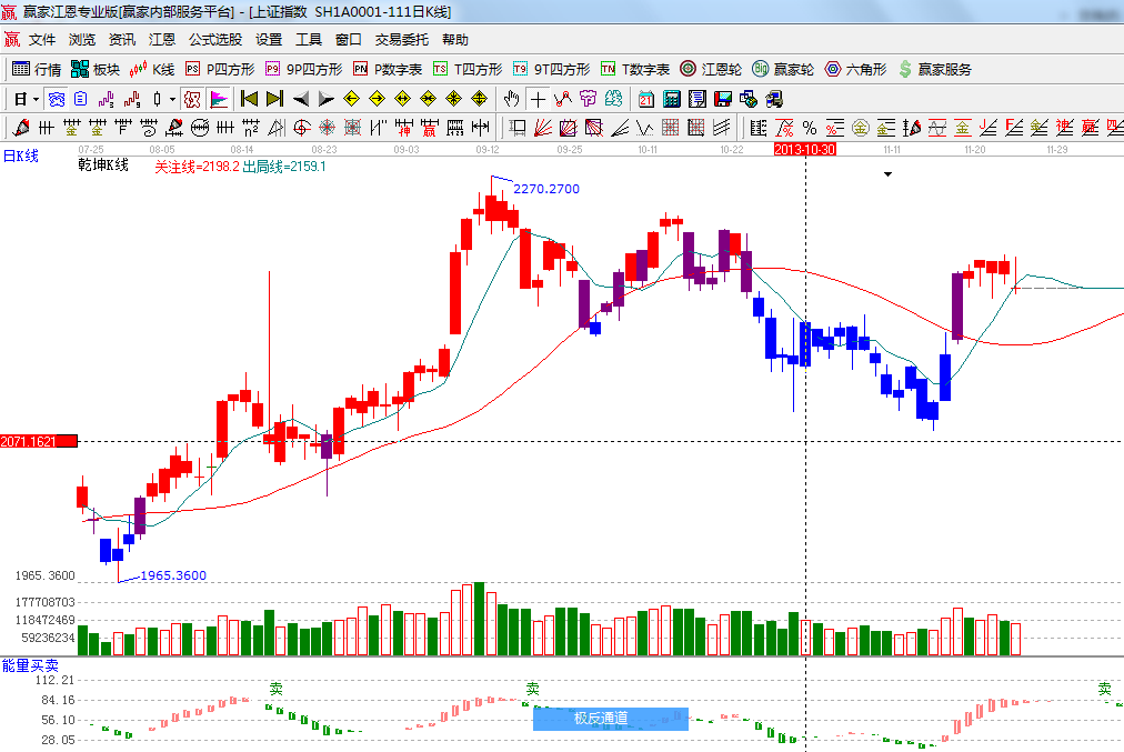 滬深兩市沖高回落收出一根帶有長上影線的倒垂線,權重股疲軟拖累大盤失守2200點,成交量較前期有所回落,從均線系統分析多條均價線在下方支撐出現快速下跌的的概率較小,同時江恩軟件特色工具極反通道分析生命線在下方支撐,時間周期費氏工具分析本周上半周短期修整將結束給出方向;盤面上以炒地圖、軍工、高送轉漲幅居前,煤炭、金融表現不佳;