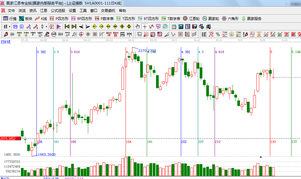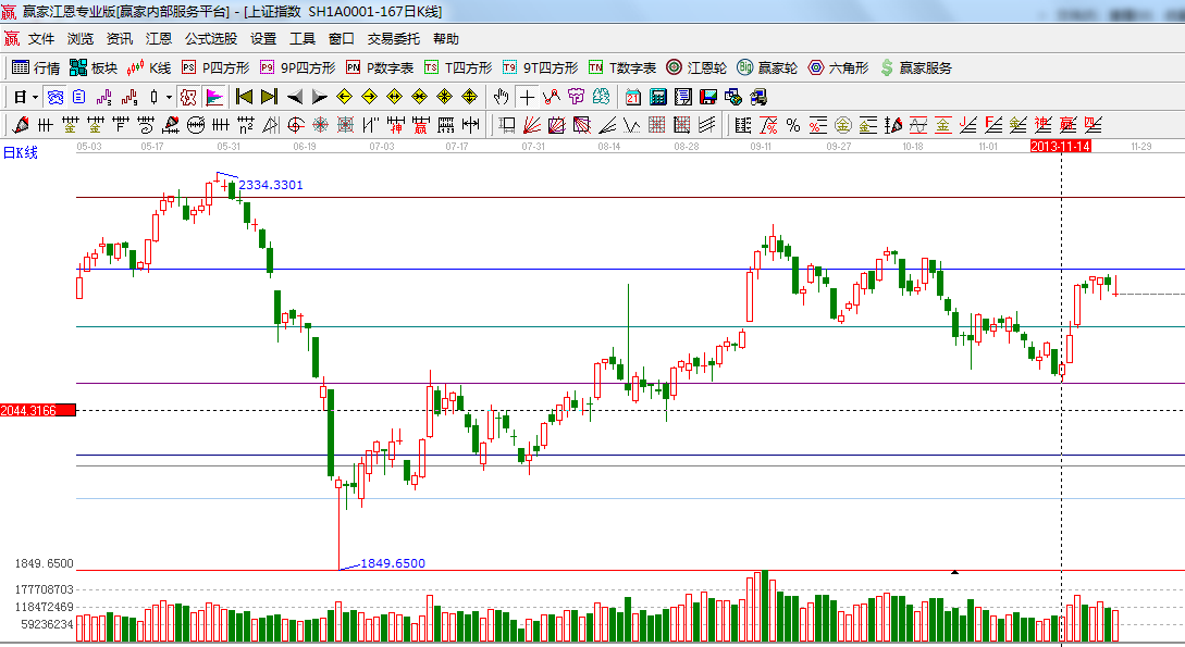 ☆依據贏家江恩系統波段百分比延伸提示:2444與1849點做黃金分割價格圖,0.382位置是2217點,0.5位置是2150點;