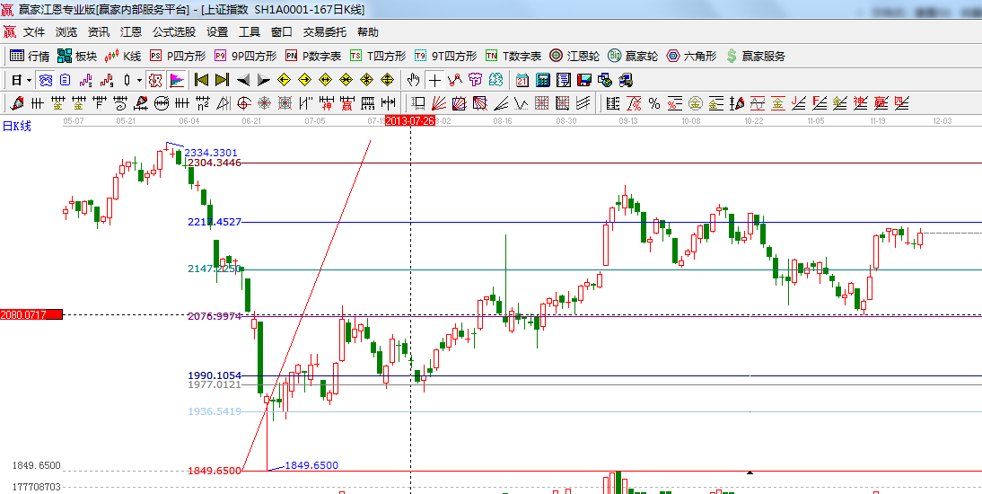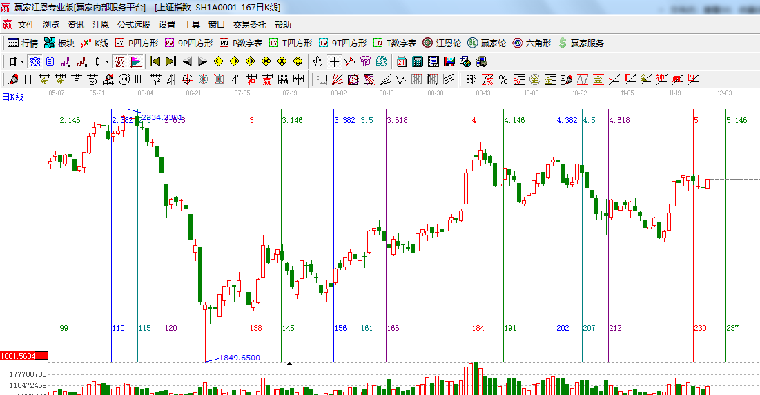 ☆依據贏家江恩系統波段百分比延伸提示:2444與1849點做黃金分割價格圖,0.382位置是2217點,0.5位置是2150點;