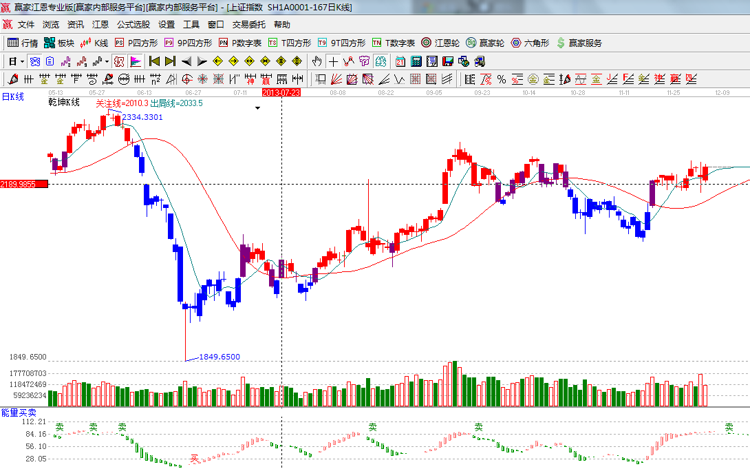 ★依據贏家江恩系統(tǒng)能量買賣提示:多方量能紅色柱子縮短,量能不能放大謹慎;