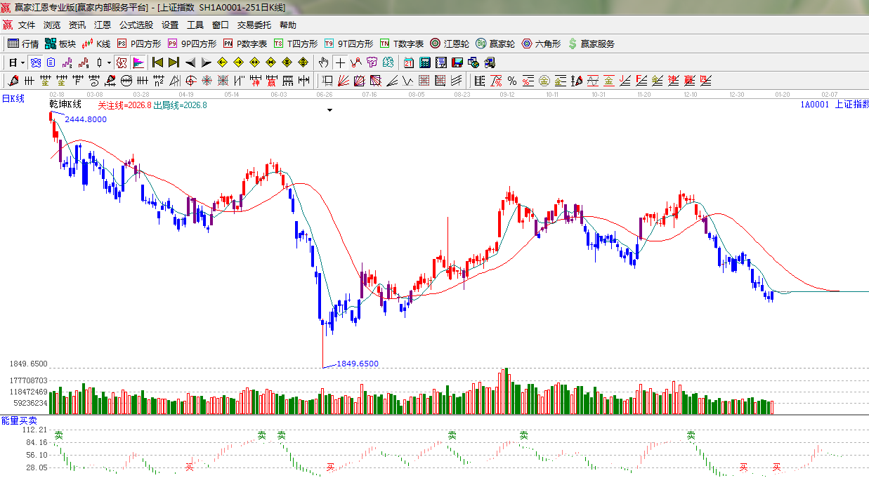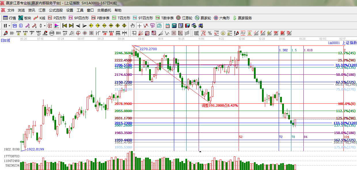 綜上所述:依據贏家江恩技術工具分析得出,時間之窗附近指數在弱勢下軌支撐如期出現探底回升走勢,量能比昨日略微放大,但整體仍處于地量水平,明天關注量能能否持續,否則謹防沖高回落,上方阻力位關注江恩90度2031,,45度2055點,操作方面,可適當提高倉位,謹慎做多,星級風險提示,謹慎做多,