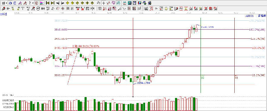 ★依據贏家江恩理論系統乾坤K線提示:滬指依舊處于紅色可操作區域,依據規則,出局線之上,繼續維持多頭。