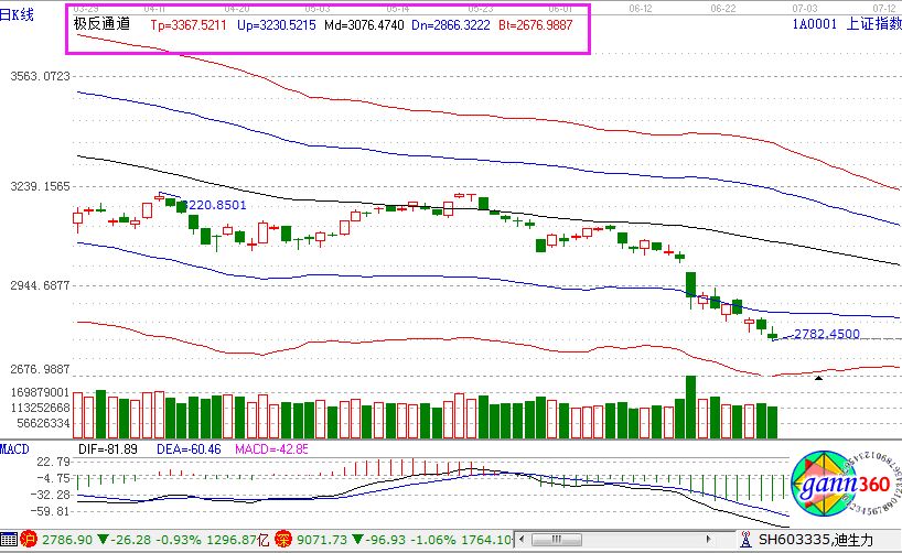 滬指跌0.93%,報收2786點;深成指跌1.06%,報收9071點;創業板跌0.17%,報收1543點。從盤面上看,證券、石油開采、高送轉、5G、景點及旅游、紡織制造等板塊漲幅居前;百度概念、分散染料、互聯網彩票、農業服務、養殖業、獨角獸概念等板塊跌幅居前。滬股通凈流入22億,深股通凈流出13億。相應的極反通道指標的支撐壓力提示,如下圖所示: