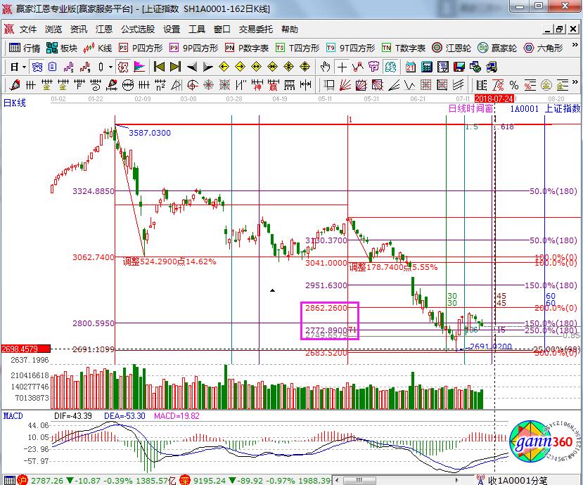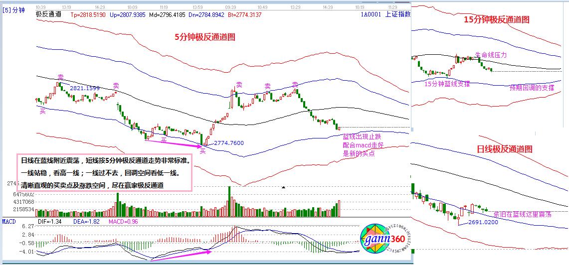 江恩看盤綜述:通過贏家江恩系統趨勢、時間、價格工具綜合評判市場二星看多(五星評級標準)。日線指數繼續在極反通道藍線這里震蕩反復,短線按5分鐘標準運行,配合15分鐘位置即可確定短線買賣信號。今日上沖2810壓力后再度回落下尋藍色下軌線,目前看短線明日將考驗2770-2750支撐區間,股價跌落到預期的支撐區間,配合macd,給出止跌信號,則是新的短線入場點。整體上,震蕩洗盤不影響短線節奏,耐心等待下周23、24日時間窗口對空間的進一步確認。