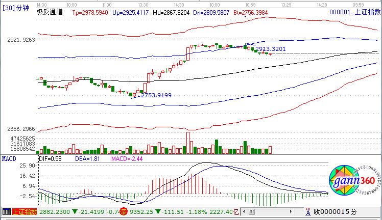 滬指跌0.74%,報(bào)收2882點(diǎn);深成指跌1.18%,報(bào)收9352點(diǎn);創(chuàng)業(yè)板跌1.61%,報(bào)收1606點(diǎn)。從板塊漲幅上看,天津自貿(mào)區(qū)、ST板塊、頁(yè)巖氣、燃?xì)馑畡?wù)、電力等板塊上漲;次新股、集成電路、半導(dǎo)體、數(shù)字中國(guó)、國(guó)產(chǎn)軟件等板塊跌幅居前。滬股通凈流入11億,深股通凈流出5.6億。相應(yīng)的極反通道指標(biāo)的支撐壓力提示,如下圖所示: