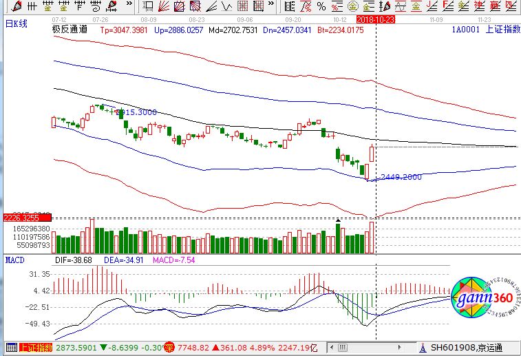 受周末利好消息刺激,A股今日全線走強,滬指放量大漲4%,再現百點長陽,一舉站上10日線,近200只個股漲停,券商更是迎來罕見漲停潮。滬指上漲4.09%,報收2654點;深成指上漲4.89%,報收7748點;創業板上漲5.2%,報收1314點。從盤面上看,券商、保險、蘋果概念等板塊漲幅居前,兩市無一板塊下跌,全線大漲。市場成交量明顯放大,兩市成交額超過4000億元。滬股通凈流出8億,深股通凈流入3.4億。相應的極反通道指標的支撐壓力提示,如下圖所示: