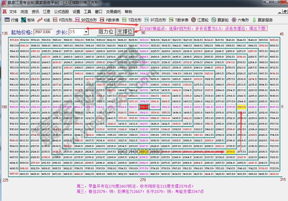 ☆依據贏家江恩理論系統江恩價格四方形提示:以3587為起點,做江恩價格四方形圖。周二,指數早盤開在2609點,剛好處于270度2607附近。全天震蕩走低,剛好收在315度2579點。周三,穩住2579,反彈壓力看2607;失守2579,將考驗支撐2547。