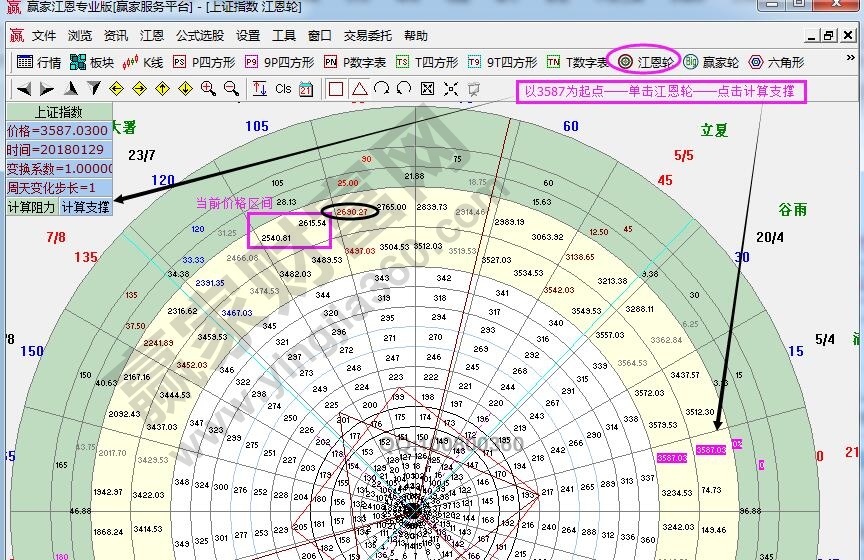 ☆依據贏家江恩理論系統江恩輪中輪提示:以3587為起點,做江恩輪中輪時空分析圖。當前受阻2615壓力點引發回落,空間上看將繼續確認2540點支撐。