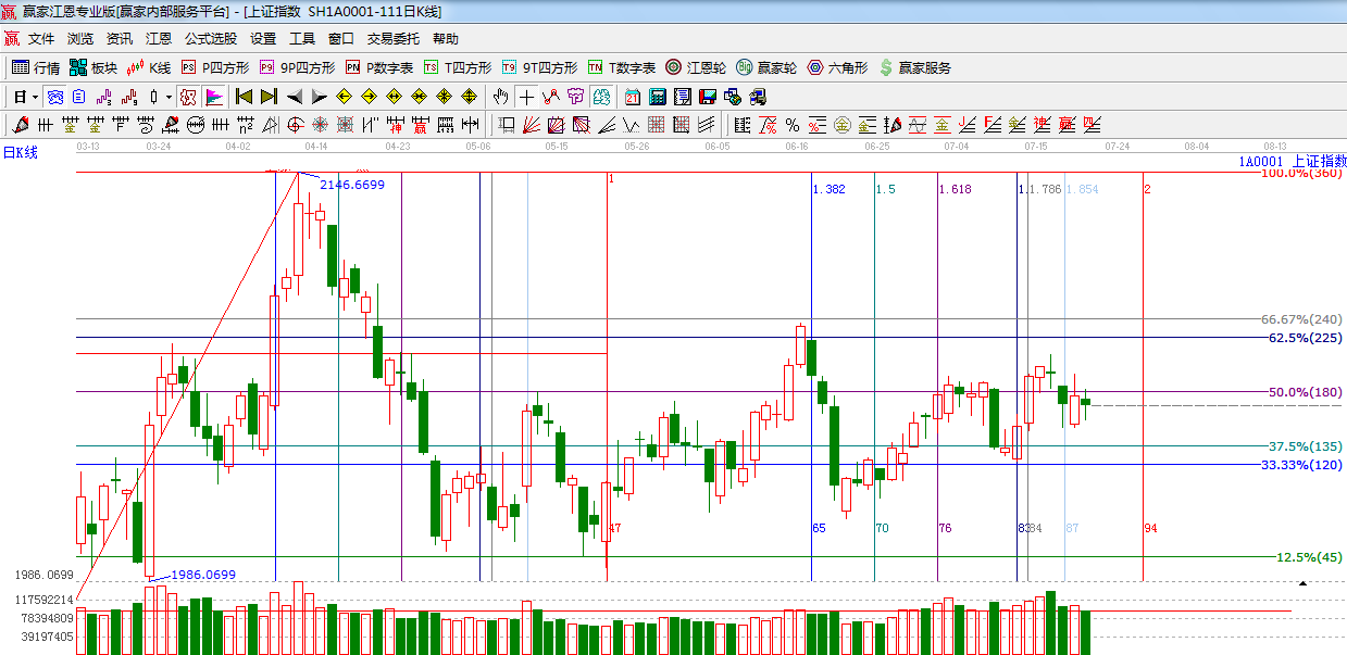 ☆依據贏家江恩系統黃金時間周期線提示:17號窗口收錘頭線,目前指數走勢并不樂觀,下一時間窗口為7月28日。