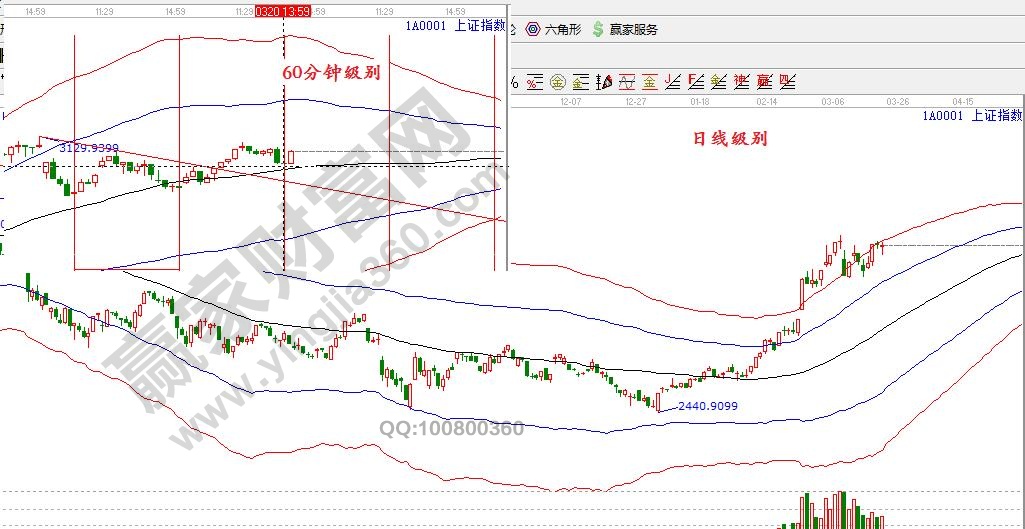 大盤日線繼續圍繞極反通道紅色外軌線震蕩運行,短期繼續關注60分鐘生命線,不破趨勢延續。空間上,3051為支撐點,3130為阻力點;時間上,關注本月26日。對應操作上,指數高位震蕩,不破3051,可繼續把握個股機會。節奏上,逢高兌現持續上攻遇阻品種,切換至生命線附近滯漲股,倉位保持4成。
