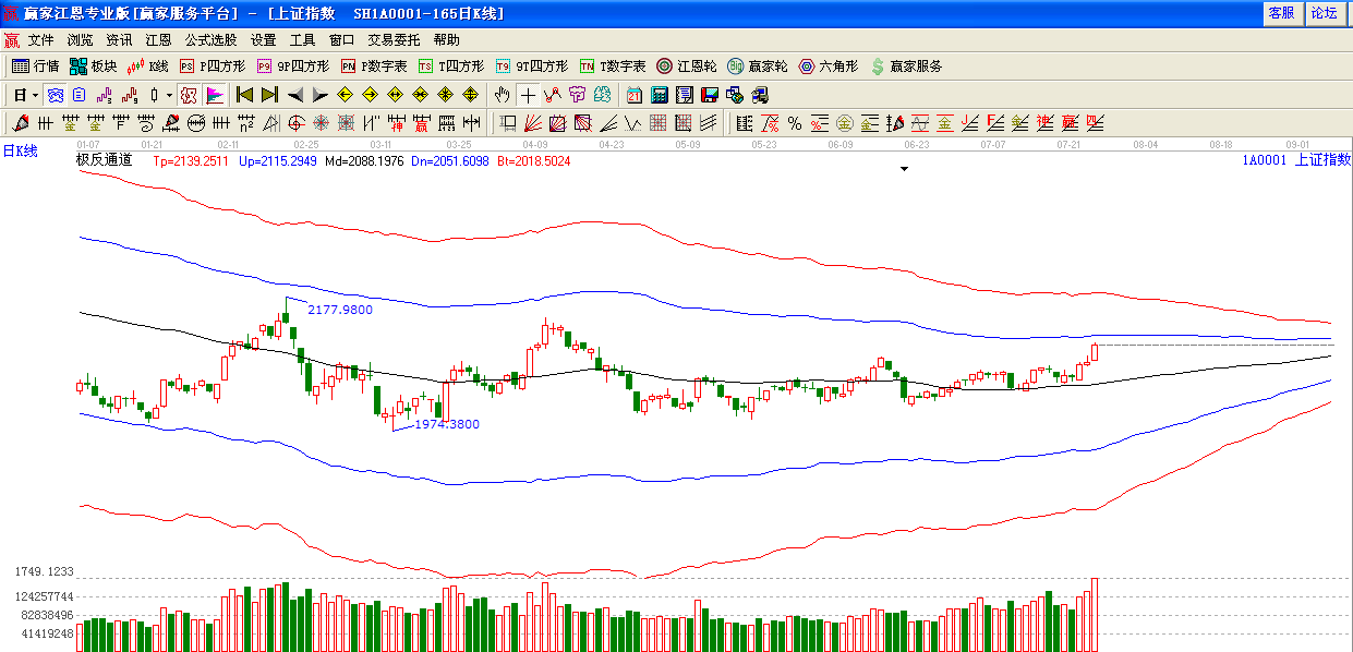 ★依據贏家江恩系統極反通道提示:在權重的帶動下,攻擊藍色外軌線,外軌線阻力2120點。