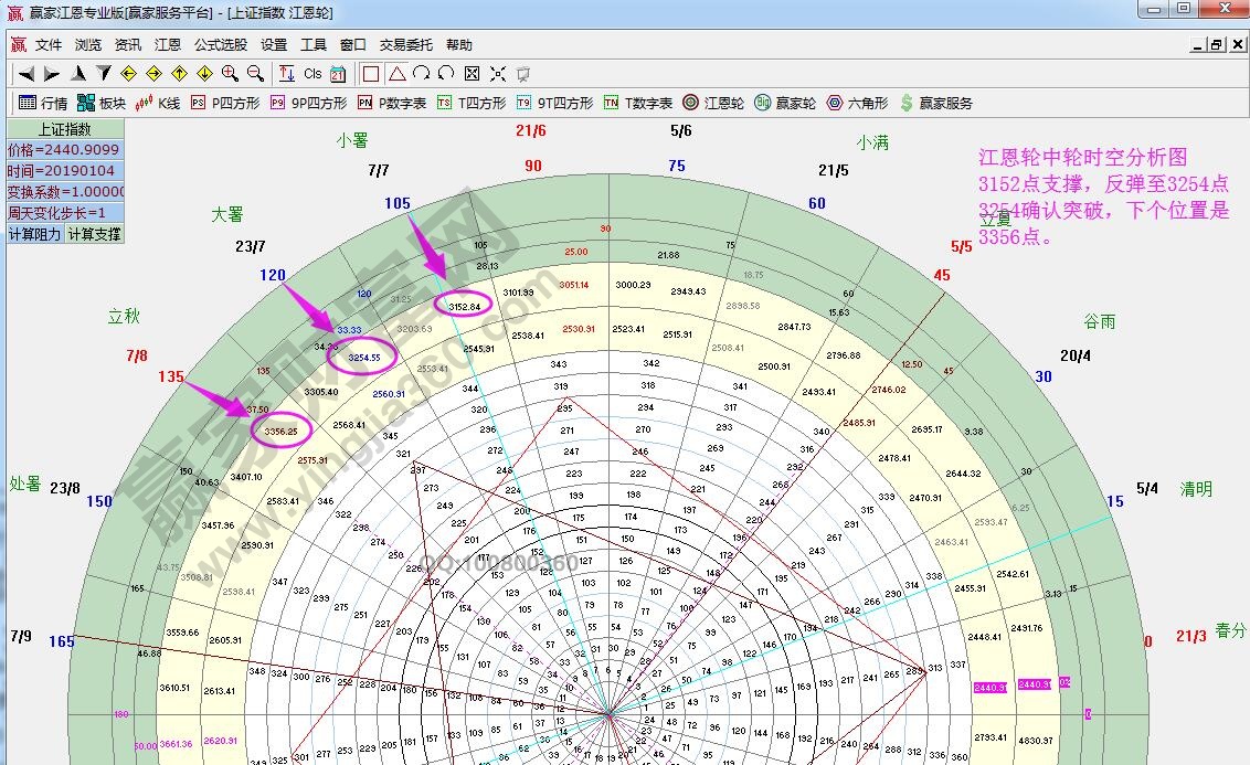 ☆依據贏家江恩理論系輪中輪提示:以2440點為起點做江恩輪中輪時空循環圖,大盤收盤站在三角形120度3254點下方,19號早盤關注此位置得失,向上循環是3305點,向下循環是3203點,上下選擇以120度3254點做決策,今日收盤在3254點下按規則看空。