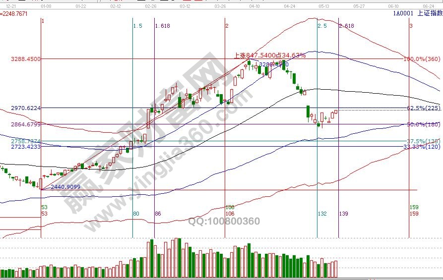 17號是贏家江恩系統時間工具提示5月第二個時間窗口,9號時間窗口與價格工具支撐2834點形成時價四方信號,周五時間窗口將遇價格反壓位2966,本周市場實際走勢同規則站穩一線看高一線原則相符,關注明天時價信號市場價格與波段百分比2倍零度位2966點關系,放量突破站上則繼續看高一線,受反壓則轉震蕩回踩確認短周期極反通道生命線,依據系統工具信號9號開倉的籌碼,按昨日分析計劃時間窗口附近先獲利部分籌碼,待確認反彈延續性后再度參與。首次關注贏家江恩的學員可查看歷史,4月22號盤后大勢分析提醒倉位降至3成,4月25號低風險者可以空倉休息,5月8號、9號開始再度進場,規避風險參與反彈,皆是通過贏家江恩體投資系判斷。17號盤中支撐壓力是270度2961點、315度2978點,盤中支撐135度2911點、180度2928點,本周五17號是5月第二個時間窗口。操作策略,指數擊破黑色生命線進入弱勢區域,目前處于短線反彈周期,高風險者倉位3-4成,風險者等待中期參考位。