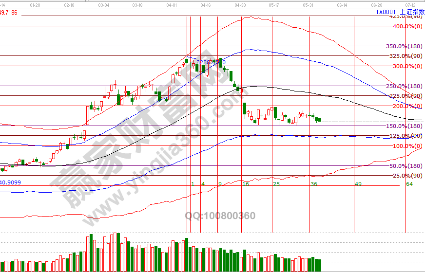 大盤時(shí)間窗口未給出明確的方向選擇,延續(xù)空間分析波段百分比延伸線1倍循環(huán)180度2834點(diǎn)與2倍零度位2966點(diǎn)區(qū)間震蕩,因端午假期,本周僅剩一個(gè)交易日,如明天市場延續(xù)震蕩格局,則下周將是周線、日線時(shí)間窗口期,維持1個(gè)月的橫盤后無論是上下市場都會(huì)給一個(gè)方向。隨著時(shí)間的推移,市場人氣情緒必會(huì)有一次爆發(fā),從技術(shù)角度研究,百分比2834-2780(極反通道藍(lán)色下軌線)這里出現(xiàn)轉(zhuǎn)強(qiáng)信號(hào)則能帶動(dòng)場外資金入場。當(dāng)前贏家江恩給出的策略為,高風(fēng)險(xiǎn)者在2840附近可以參與,運(yùn)用區(qū)間交易法;低風(fēng)險(xiǎn)者可以等出現(xiàn)中陽或指數(shù)靠近藍(lán)色下軌線附近開倉。6號(hào)盤中壓力是45度2877點(diǎn)、90度2894點(diǎn),盤中支撐是315度2844、270度2829點(diǎn)。操作策略,指數(shù)擊破黑色生命線進(jìn)入弱勢區(qū)域,整體持倉保持在3-4成,做到進(jìn)可攻退可守。