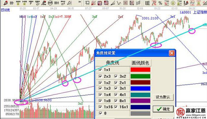 江恩角度線是分上升角度線和下降角度線的,在以每天波動(dòng)幾個(gè)點(diǎn)的上漲速度延伸的,其中1*1角度線是非常重要的,因?yàn)檫@里是多空強(qiáng)勢(shì)的分界線,當(dāng)然除此之外還有的1*2、1*3、1*4、1*8、1*16、2*3、3*2、2*1、3*1、4*1、8*1、16*1、角度線,把市場(chǎng)分割了13個(gè)區(qū)域.而角度線在交易中有支撐壓力作用。我們來看下面的上證指數(shù)圖。