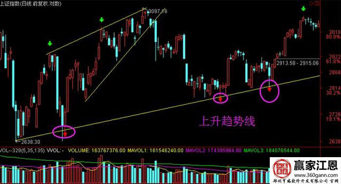 上圖是本人在2017年1月17日做所的一張上證指數(shù)圖,顯然上面就是一個(gè)非常明顯的上升趨勢(shì)線,就是以每一次的低點(diǎn)的連線來畫線,像上面那樣就是上升趨勢(shì)線,當(dāng)然相反的下降趨勢(shì)線就是以反彈的高點(diǎn)連線來做線,如果股價(jià)突破下降趨勢(shì)線,那么即意味著股價(jià)將會(huì)反轉(zhuǎn)。所以趨勢(shì)線就是相鄰兩個(gè)低點(diǎn)或者高點(diǎn)所構(gòu)成的直線射線延伸。顯然是不同與上面所講的江恩角度線的。
