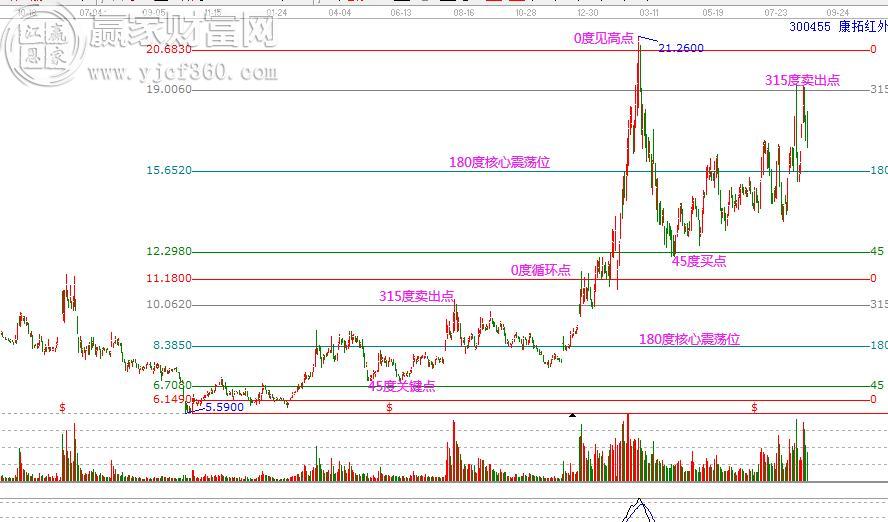 圖形解析:康拓紅外,階段低點5.59,以此價格為起點,作出K線價格四方形,同時,步長設定為起點5.59的0.1倍,即0.559;結合市場具體的走勢,保留關鍵的0度,45度,180度及315度。我們可以看到在不同的循環中,45度的兩波啟動,同時180度的震蕩走勢,以及315度的關鍵賣出點,以及最重要的0度循環位的頂點。