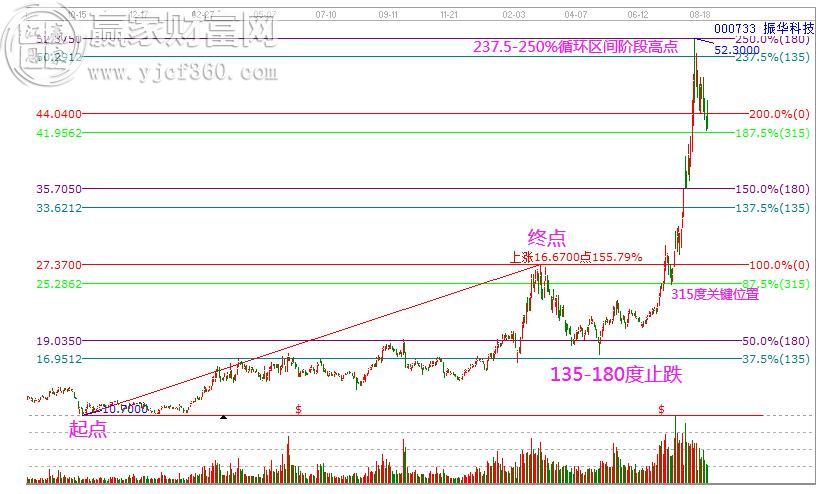 圖形解析:振華科技,以2018年10月16日低點(diǎn)到2020年2月26日高點(diǎn)這波上漲為起始因子,通過對波段內(nèi)的運(yùn)行結(jié)構(gòu)分析,保留135度,180度,及315度關(guān)鍵分割位,可以看到市場啟動之后,其階段高點(diǎn)出現(xiàn)在237.5-250%循環(huán)區(qū)間。