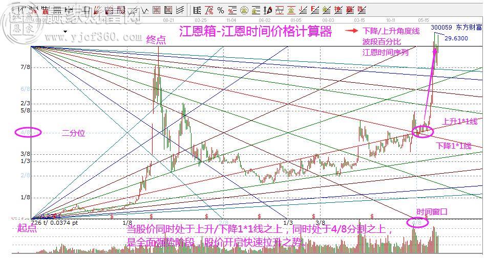 圖形解析:東方財(cái)富,以2012年12月7日低點(diǎn)和2015年6月5日高點(diǎn)為起始波段,時(shí)間周期為121周,根據(jù)市場具體的走勢,步長設(shè)定為121*6=726周,得出如上的分析圖。可以看到市場價(jià)格在周期內(nèi)的波動(dòng)情況,其中最關(guān)鍵的角度線的1*1線都是重要的阻力和支撐點(diǎn),以及價(jià)格的4/8分割位,而當(dāng)股價(jià)同時(shí)站上了兩條角度線的1*1線和價(jià)格的4/8分割位,就意味著市場趨勢非常強(qiáng)勢。因而,當(dāng)股價(jià)突破了這幾個(gè)關(guān)鍵的位置后,4/8分割時(shí)間序列窗口開啟主升。