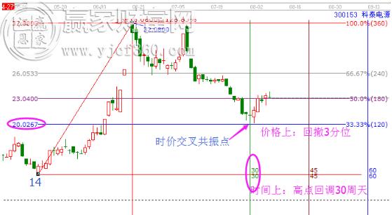 如圖,以300153科泰電源為例。首先來看價格。當前走勢處于14-32.08這個上漲波段的回撤空間內,則我們選取波段百分比工具來作圖。以14為起點,32.08為終點作圖,可以得到:自32.08展開的回調,剛好回落到120度3分位附近,20元附近為價格上的重要支撐位。接著,來看時間。利用自定義周天循環線,以本輪高點32.08這一天為起點,可以看到本輪調整已經運行了30交易日,符合江恩時間法則。價格上回撤3分位,時間上滿足回調30周天法則,橫著的價格線和豎著的時間線交叉形成共振點,直接轉勢往上。