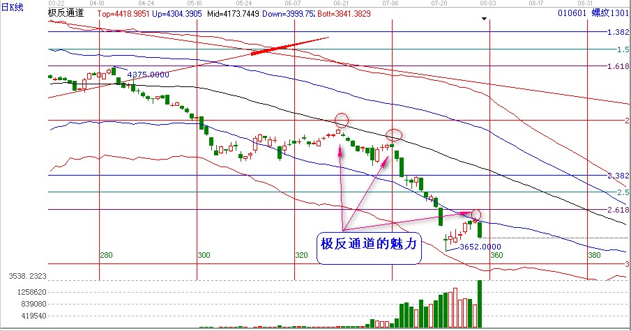 螺紋從3652點(diǎn)紅色下軌的位置,超跌反彈后上漲至極反通道藍(lán)色外軌道線的位置,受阻,進(jìn)日低開(kāi)后一路走低,收出了一根大陰線,再次體應(yīng)驗(yàn) 了應(yīng)急極反通道的神奇之處【跟上次提到的點(diǎn)位誤差之差6個(gè)點(diǎn),分析3776空單,最高在3782點(diǎn)】
