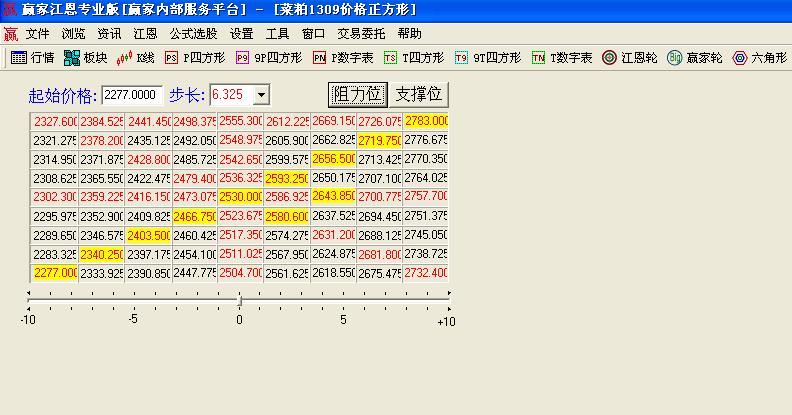 江恩價格正方形在其江恩理論中是較為常用的分析工具之一,江恩價格正方形可以把價格的重要高低點演繹的淋漓盡致。在實戰中重要的點位經常發生一些重要的轉折。有著重要的指導性應用。
