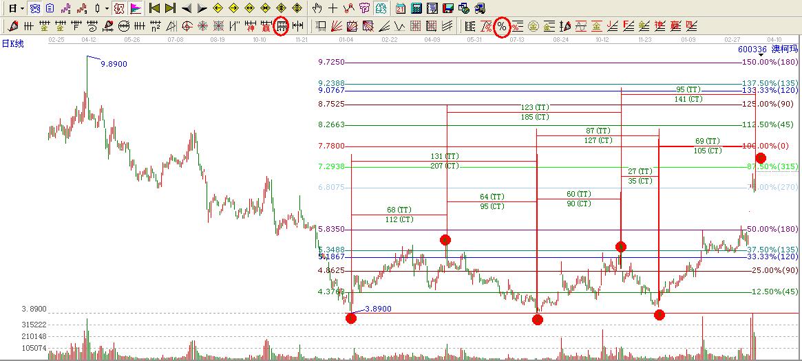 江恩理論之所以在金融界被稱作3大理論之一,是因為其很多東西久經(jīng)市場的考驗的,江恩是一套以時間為核心的理論, 對其金融市場進行分析預(yù)測,其方法預(yù)測準確性讓很多人癡迷,其實江恩的預(yù)測系統(tǒng)跟交易系統(tǒng)是完全獨立的2個系統(tǒng),在預(yù)測出現(xiàn)失誤的時候,會靠其嚴格的規(guī)則執(zhí)行紀律:例如規(guī)則2 在單底、雙底和三重底買入。今天我們就以600336 澳柯瑪對其解讀如圖所示: