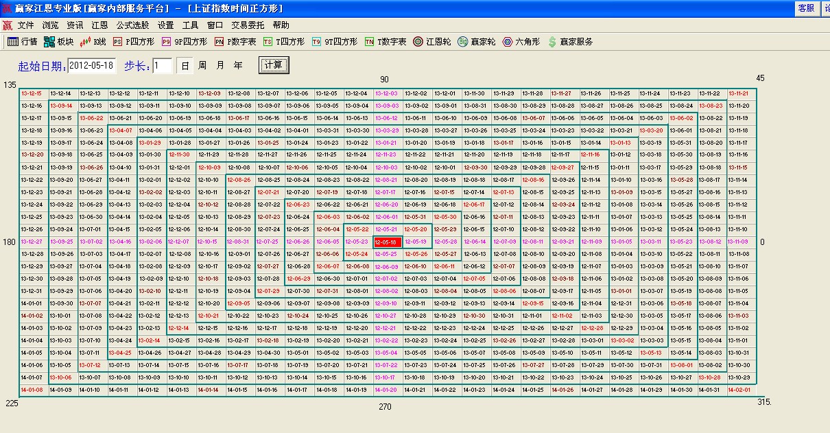 江恩四方形在贏家江恩軟件上使用方法已做過講解大家可百度查詢學習,今天我們講下手動做時間四方形,首先準備一張白紙,用1*1的比例畫出四方格子,橫堅為25格,圖形做好后中心格子為我們選擇的分析時間周期的起點,然后計算好步長(波動率),逐步逆時針展開可以繪圖了;