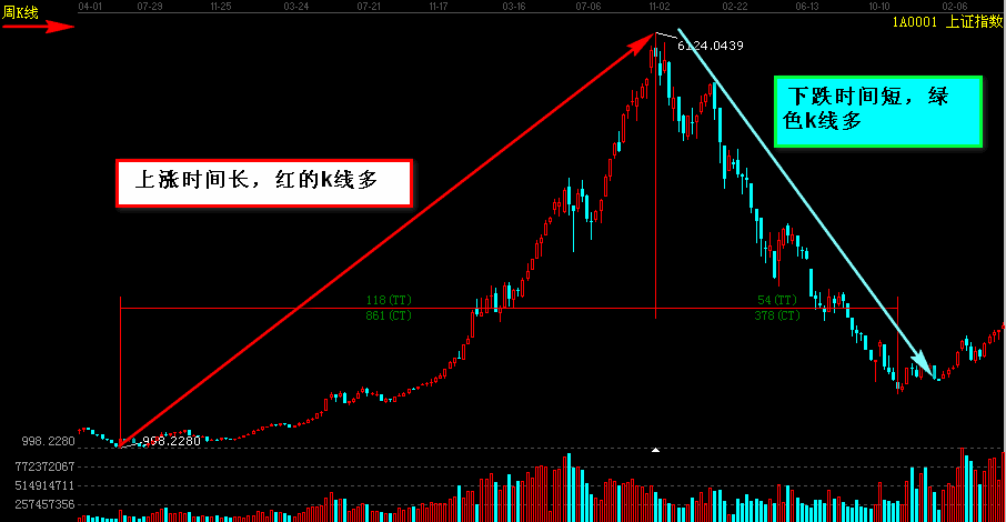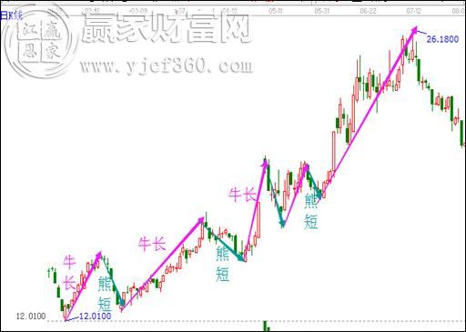 ?!蠞q階段,熊——下跌階段,“牛長熊短”即上漲階段要長于下跌階段。不管是大盤還是個股,觀察其走勢,若上漲的時間長,而下跌的時間短,則代表多頭強勢,該股后市仍繼續看好。反之,若下跌的時間大于上漲的時間,則該股弱勢不予考慮。