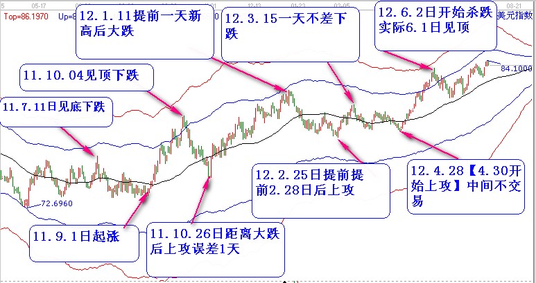 2011年9月1日美元指數在四方形時間315度位置止跌上攻一路上攻到2011年10月10日.2011年10月4日也是時間四方形重要轉折點,然后一路暴跌至2.11年10月27日,時間四方形在11年10月26日提起一天發出信號,然后一路上揚,隨后的重要轉折點例如:12年1月1日;12年2月25日;12年3月15日;12年4月28日;12年6月2日。