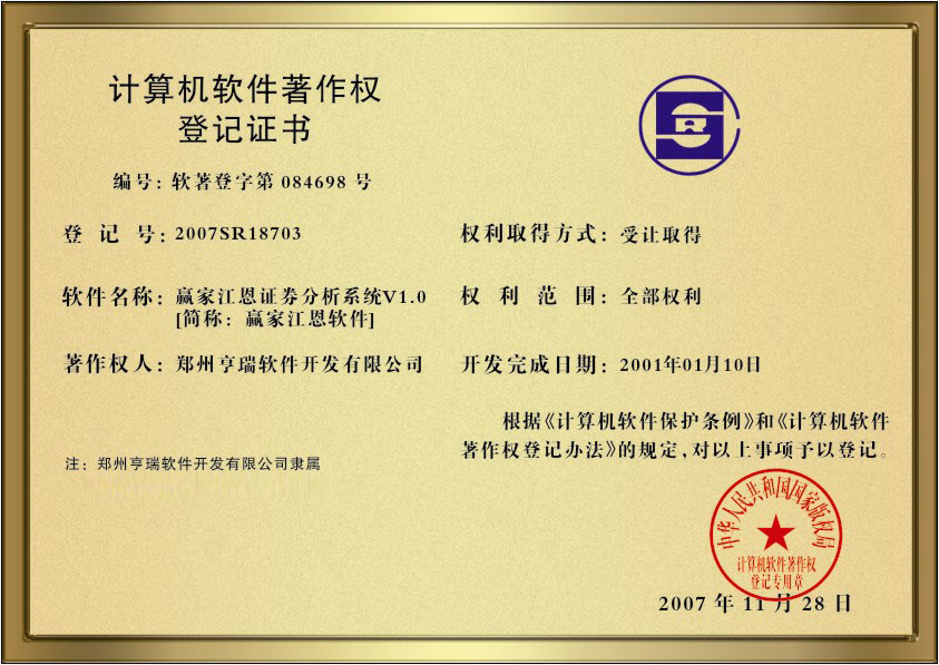 2007年獲得國家《計算機軟件著作登記證書》